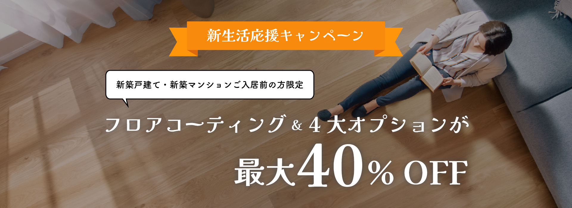 割引内容:フロアコーティングとその他オプションサービス(エコカラット、水廻りコーティング、防カビ・消臭コーティング、ガラスフィルム)を組み合わせることで、最大40%OFFの特別価格でご提供します。